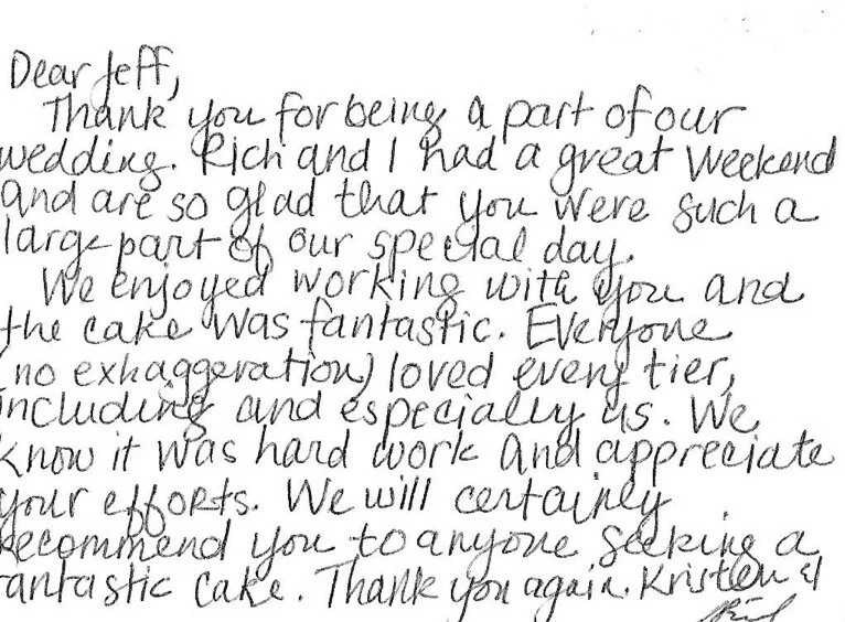 We enjoyed working with you and the cake was fantastic. Everyone (no exaggeration) loved every tier, including and especially us. We know it was hard work and appreciate your efforts. We will certainly recommend you to anyone seeking a fantastic cake.
